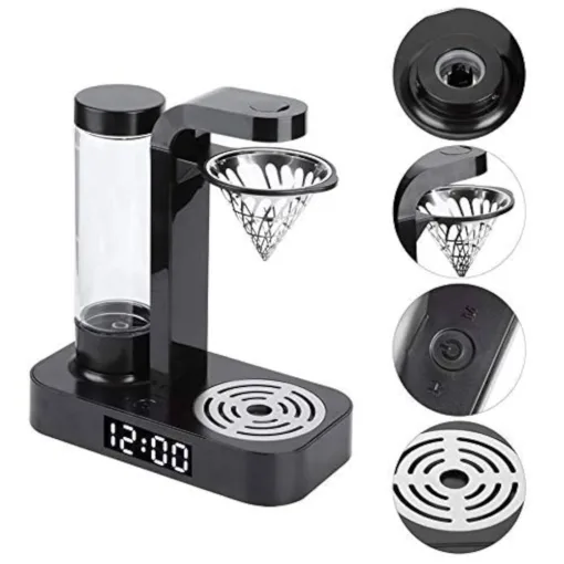Programmable drip coffee machine with reusable filter and keep-warm feature.